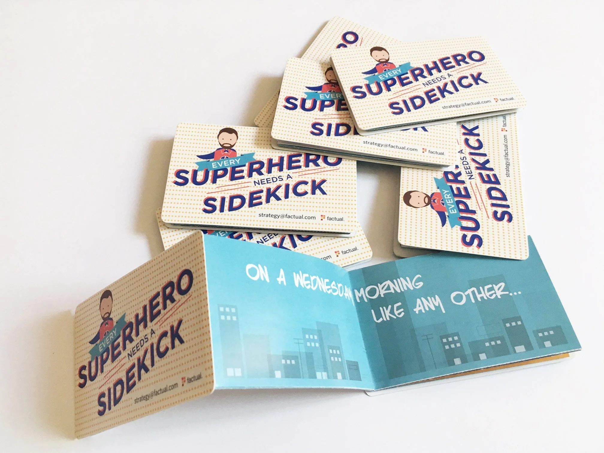 I designed these double-sided sheets that share the value of working with the Factual strategy team through a comic. To make these personal, each of the character was drawn to represent an actual Factual sales rep.